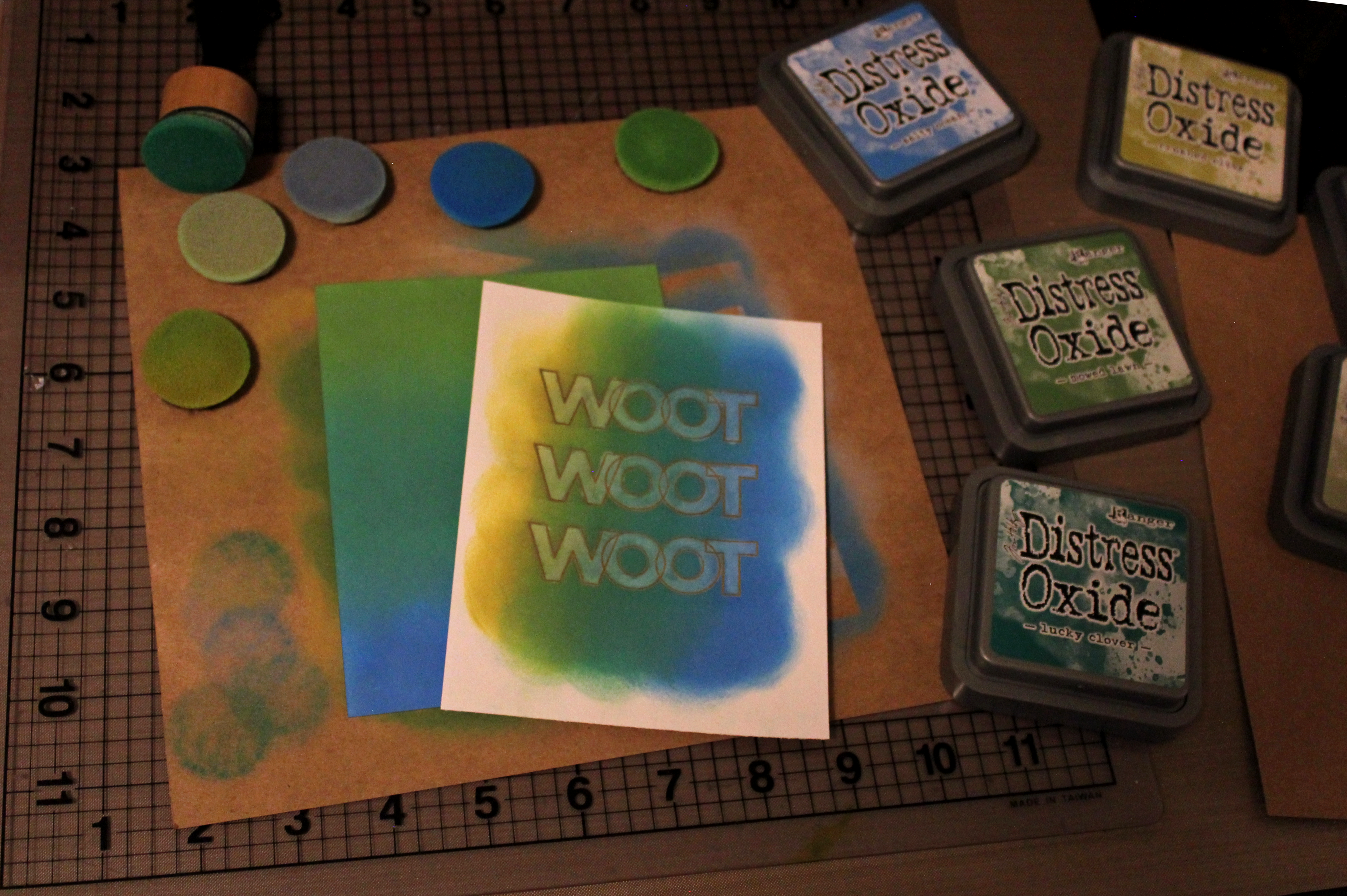 After heat embossing this fun “Woot” stamp from the CZ Design Birthday Palooza stamp set, I blended blue and green inks over the message.